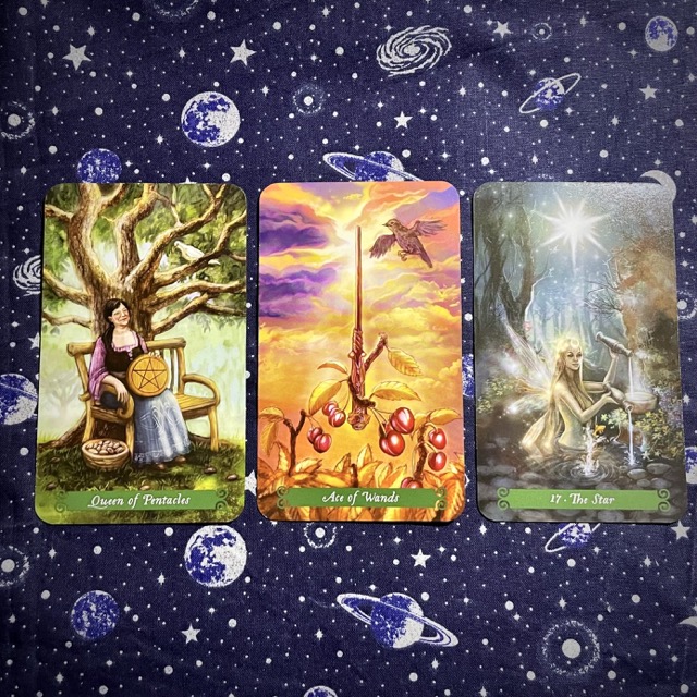 Three tarot cards, the Queen of Pentacles, Ace of Wands, and the Star
